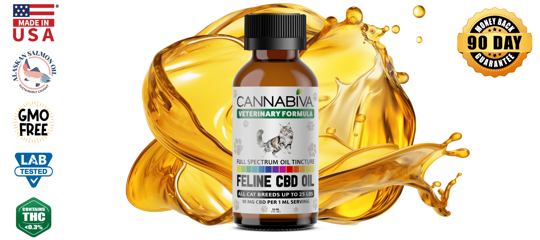 Cannabiva Feline CBD oil is formulated with just two meowgical ingredients: cat-safe cannabidiol—better known as CBD extract—and sustainably sourced wild Alaskan salmon oil.